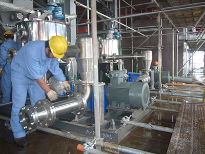 HFM型分散研磨器装置(撬)由溶解罐、分散研磨机和混合器组成。溶解罐设有切向的一次进水口,进水与上部的物料进入罐内,罐顶的搅拌机使其旋转搅拌,达到初步的混合。随后由下部的出口进入分散研磨机,使通过机器的物料能同时完成粉碎、分散、乳化、均质和输送。混合器利用文丘里管形分配器把分散粉碎机的来液和二次进水送入旋流混合和静态混合,以达到均匀分散溶解的最佳效果。